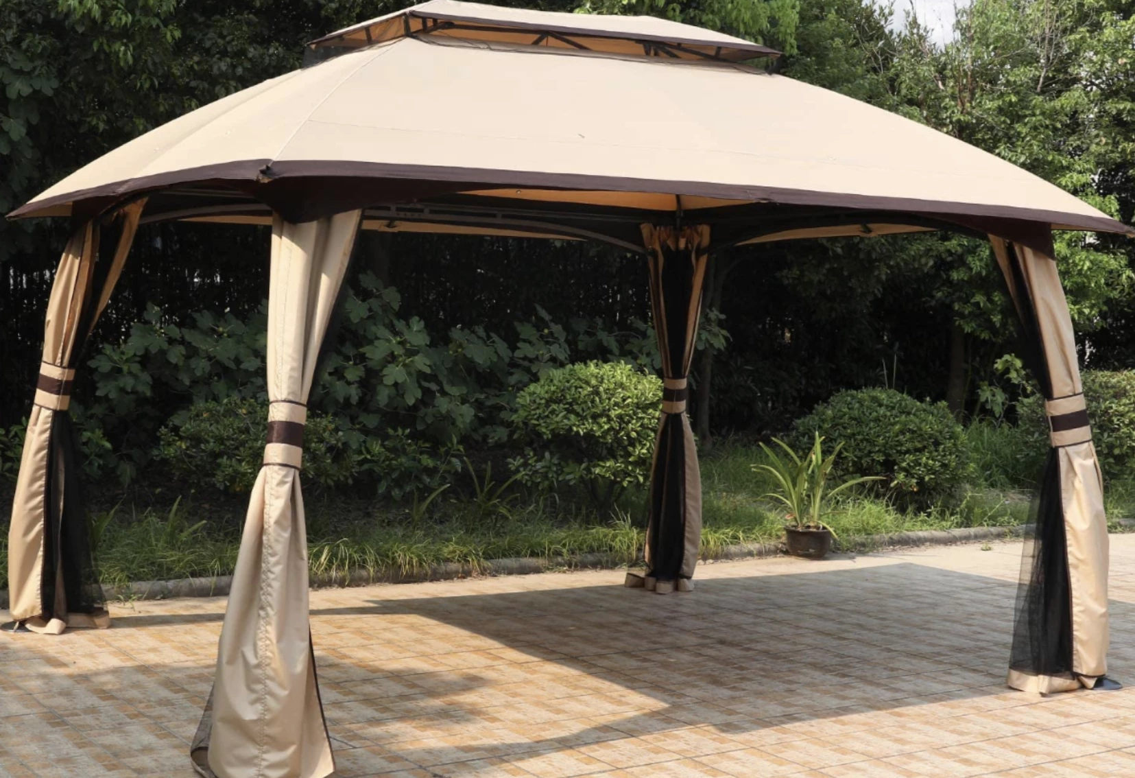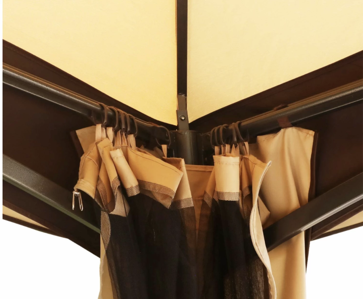 - REMOVABLE NETTING WALLS: Features 4 enclose zippered screen nets and 300D polyester corner curtains. Protect you from the sun and rain as well as flying insects, while still having full airflow and visibility. Velcro straps allowing you to adjust the mosquito nets or corner curtains coverage to fit your needs, beautiful and practical, hope you enjoy the great outdoor time from your private gazebo.
