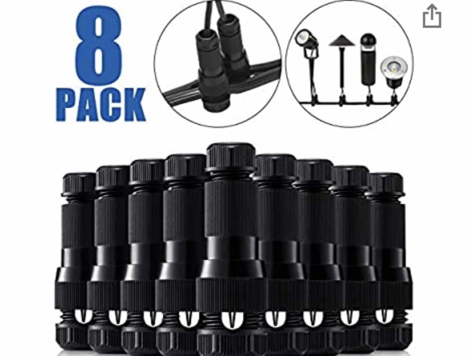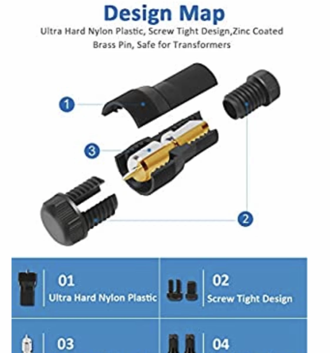 Perfect Landscape Light Connector: 8 Pack low voltage cable connectors with best improved Screw Tight Design, enough to connect 4 Pack low voltage outdoor light fixtures or replace faulty connector, more reliable than push or pinch style connector.- Ultra Strong Nylon Plastic and Brass Pin:landscape lighting connectors are made of extremely sturdy nylon plastic + fiberglass mixture and CNC machined nickel- plated brass pins to ensure corrosion resistance and electrial conductivity for outdoor use.