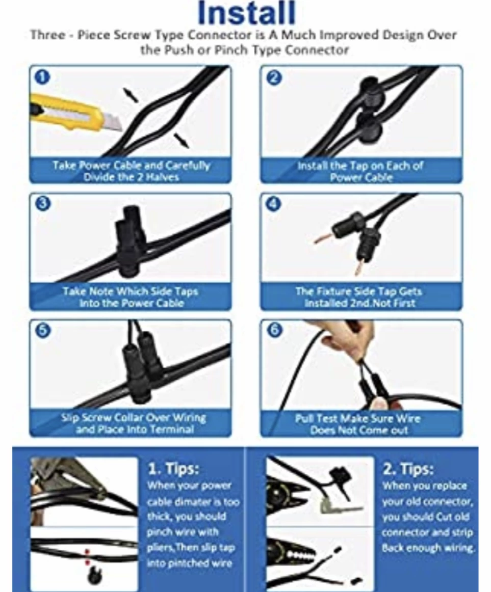 - Super Easy to Install: No crimping, No cutting, No splicing. Great improved design and high quality machining ensures reliable connections for years.Only take 3 minutes to connector your landscape lights easily and quickly.