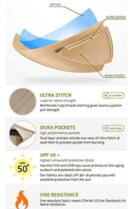 - UPF 50+, water resistant, CPAI-84 fire retardant