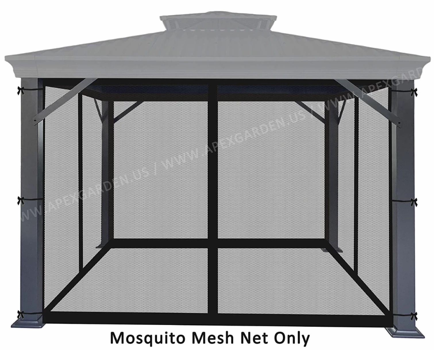 - The Mosquito Netting fits most 10′ x 10′ gazebos.. . Metal Grommet Top. Four(4) walls enclosures. Zippers in center of each side allows for easy entry and exit.